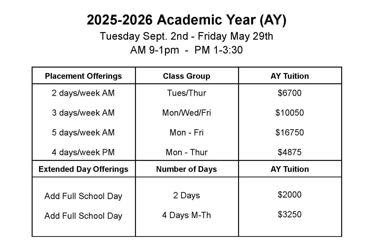 Tuition is paid on a monthly basis or as a lump sum. There is a 10% non-refundable deposit required to guarantee your child’s school roster spot and it is applied toward the total tuition due.